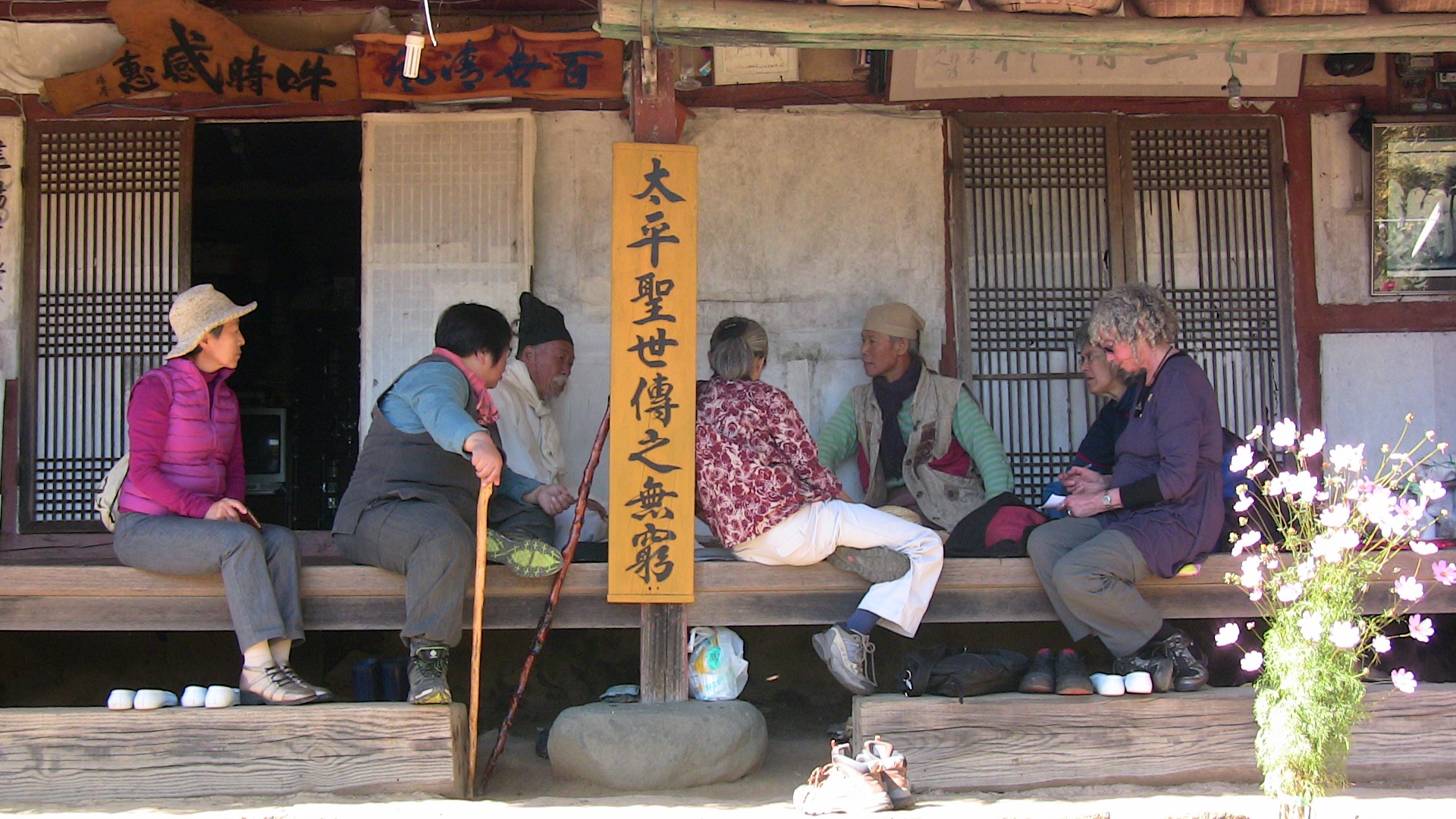 Then a long drive, stopping at the tea shop of eco-feminist, singer-songwriter Hae Kyoung Ahn who had baked bread especially for us. We did some sightseeing, and at last arrived at Mago Castle,[5] Mt. Jiri!