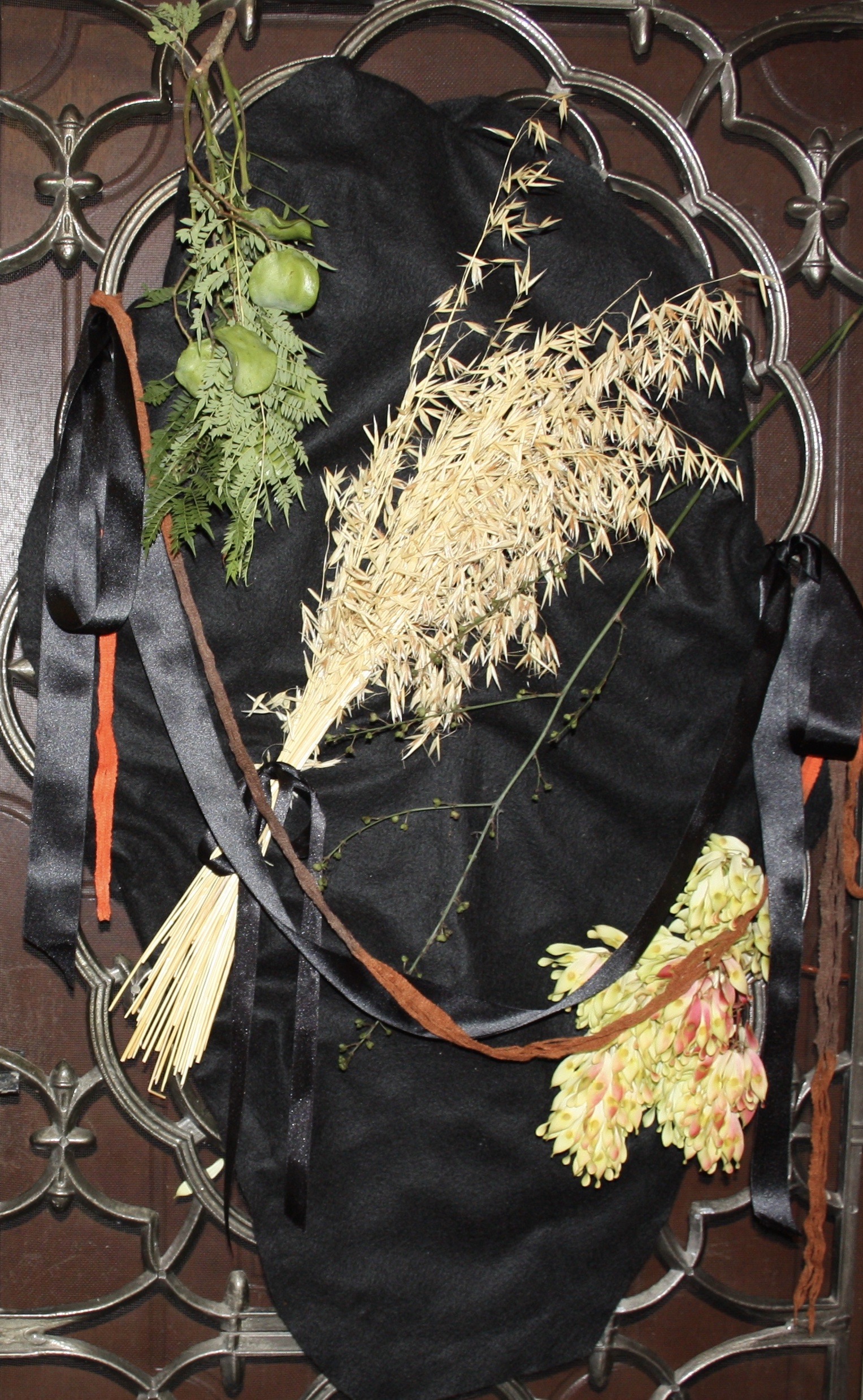 The blackness of the fabrics and ribbons is for the honoring of this essential nature and pre-dominant quality of the Cosmos; a making of sacred space for contemplation of the blackness that we are actually immersed in and is within our whole being. It may be recognised as a sentient fertile space, perhaps more correctly as the sentient fertile space, out of which all arises.