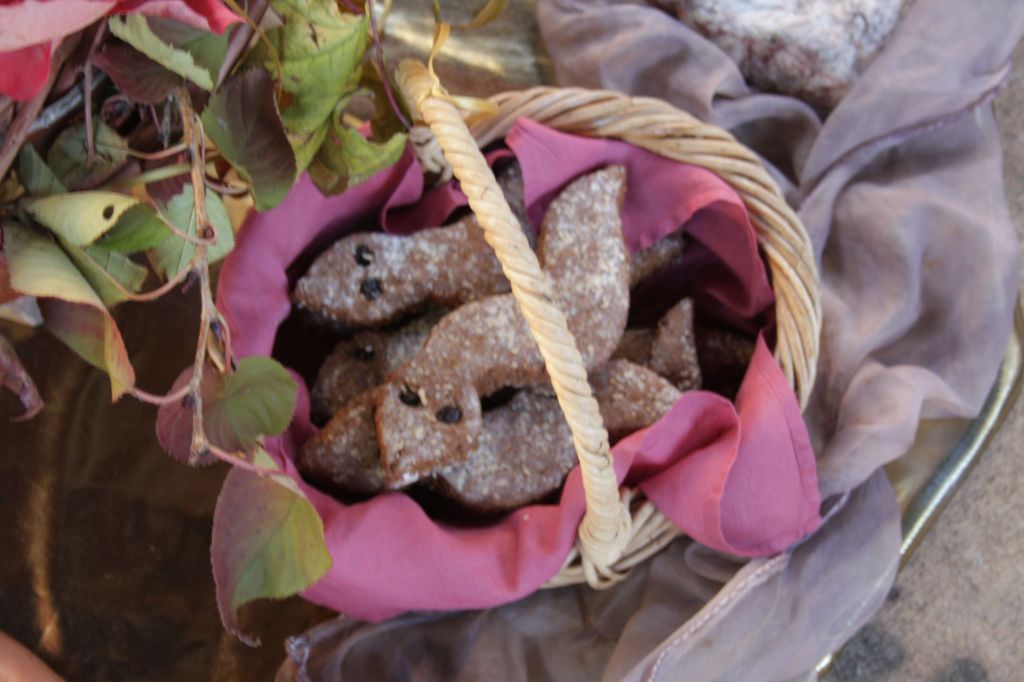 In the game/rite each participant travels in and out of upraised and linked hands and arms of the circle, and when “In” may speak and/or show photos of themselves from the past. Some may choose to remember any self from the entire evolutionary story, with whom they would like to identify. Each is praised for their “becomings” each time “In”. Each person may do this a few times. When all are done, all are addressed and praised by the celebrant as “Great Ones” for having come through so many changes/transformations, as Gaia Herself has done. They are then each presented with gingerbread snakes, “Gaian totems of life renewed,” which will be consumed in three parts.