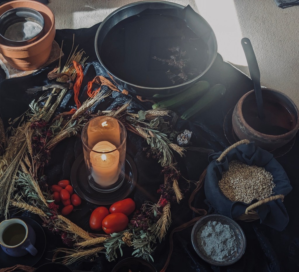 Props needed: frankincense (stick is fine), a small bowl of ash, a small bowl of grain, a gingerbread/bread figure – perhaps in a basket lined with black fabric, a “cauldron”/pot … could be a clay garden pot.