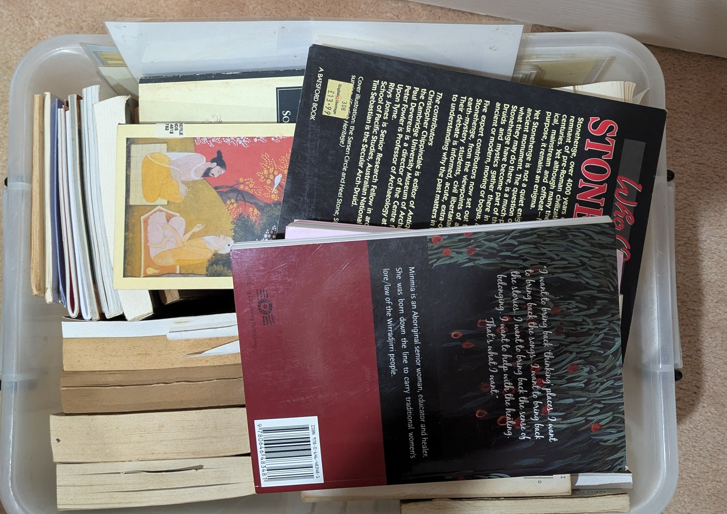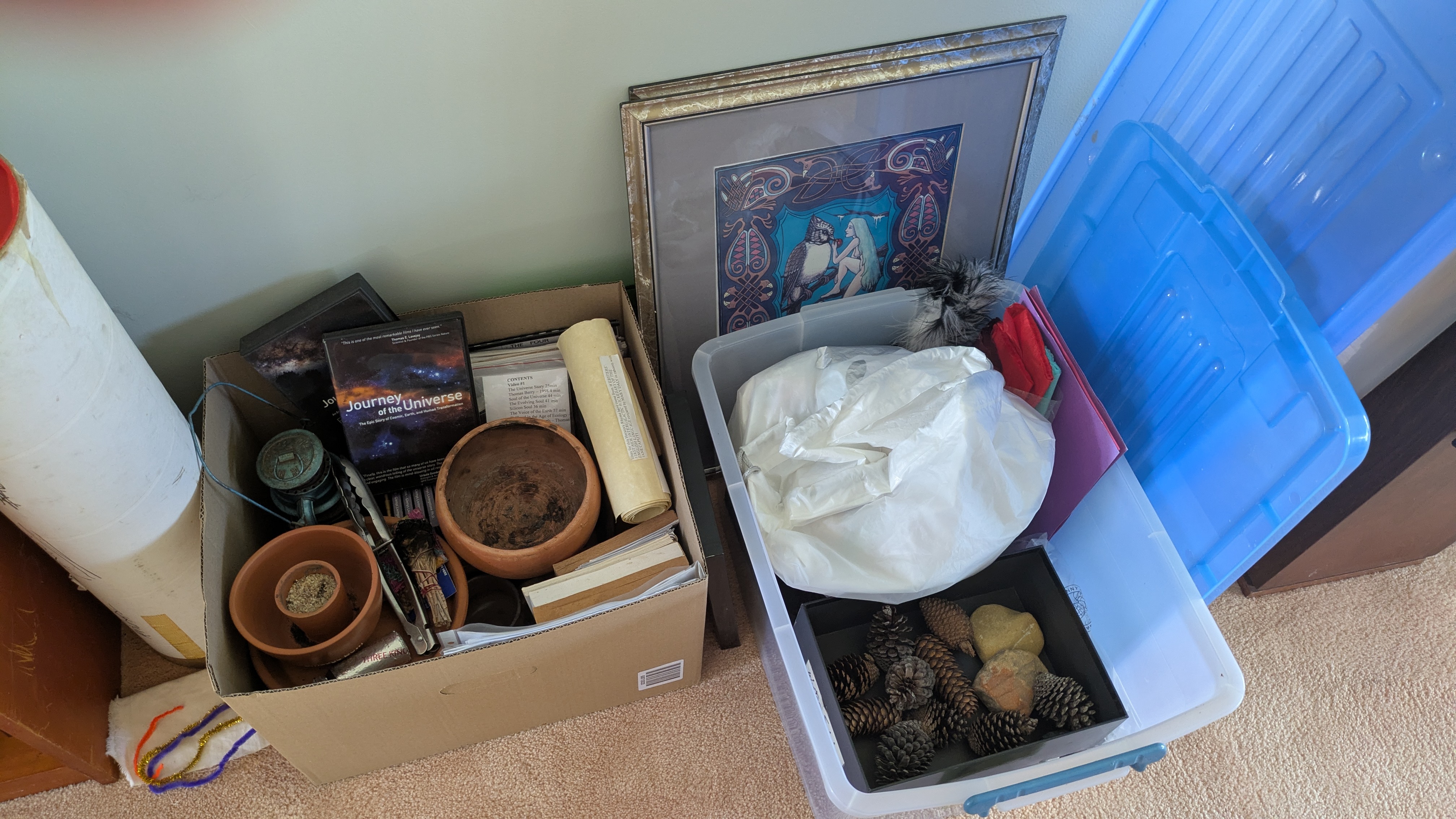 The passing of this personal phase of creativity has not been timed with my biological clock, as in the ending of menstruation: that happened almost twenty years ago. This phase of creativity that is passing has occupied my life for about thirty years or more, and I understand it as a ‘Mother’ phase, the full flowering and carrying forth of my life’s passion/purpose. Its passing is timed more with a recognition of aging, a decline in capacities to carry that particular creativity forth any longer – the body just won’t do it. I am entering more deeply into Crone phase; and thus letting go of much, a lot of my priestess tools and props, and some academic reference books and journals that have served me for these creative decades.