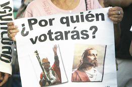 It didn’t go unnoticed that Pachamama came first. Fundamentalist Christians were up in arms (literally), accusing the government of idolatry and blasphemy. This placard, being carried in the lead-up to the referendum, reads: ‘Who will you vote for?’