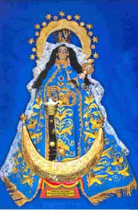 The next 300 years were ones of ruthless sack and pillage for the Andes and its peoples. The potato-growers became serfs in the Spaniards’ haciendas, a situation that endured until the middle of the 20th century. And the Pachamama? The Spaniards persecuted yatiris, but knew they could not eradicate from among the people their devotion to the Pachamama. The Spaniards enlisted the Blessed Virgin to subsume Her, as you might already have guessed. But let us remember who the Blessed Virgin is, herself. She is the old Earth Goddess in Christian guise: Tanit, worshipped in what is now Spain before the Romans came Can we not see the same triangular shape, the crescent moon.