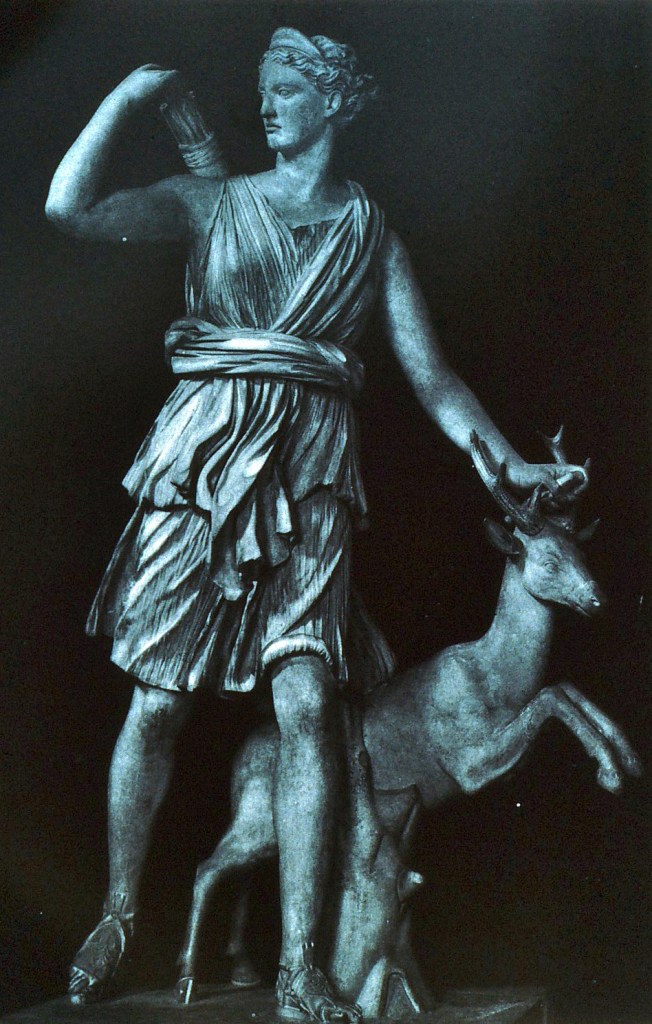 As Artemis in Greece, in Her Virgin aspect She was revered as midwife because of her single-minded drive to bring life into being.[8]The earliest stories of Artemis speak of a Goddess for whom “each creature – each plant, each wood, each river – is … a Thou, not an it.”[9]Women called upon Her in childbirth, and the labour-easing herbs used by midwives in Old Europe were called Artemisia. Artemis came to be known as One that protected and nurtured the young and vulnerable, the will to life, the spirit[10]– as much concerned with physical being as with the making of soul; there was no separation. As Virgin, Artemis was associated with untamed nature, the pre-domesticated, the pre-informed, the wild. She was the possibility of the open mind, the new and untried. She had no need to be afraid, because She was certain of taking care of Herself. Artemis was known as a Mighty Huntress, and in earliest human cultures this was not contradictory to deep relationship with the animals that were hunted. She was also known as Lady of the Beasts; the deer was often Her animal – an animal associated with birth and renewal, and the bear associated with rebirth/hibernation and fierce mothering. Artemis is often depicted as an archer. Her arrow that flies true and on centre, is just as surely the arrow of Self.