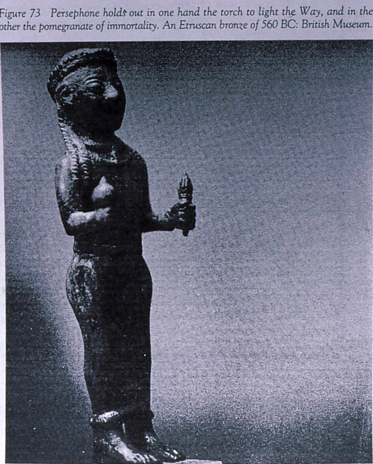 Persephone is a Virgin Goddess who has been to hell and back. In the earliest story of Persephone,[20]the Crone and the Virgin aspects are inseparable: Persephone chooses to go to the underworld and indeed becomes Sovereign. She comes to know this realm, to guide others through it, and is equally associated with re-emergence, re-generation. She is not a naive Virgin; she goes into the darkness in trust, knowing its fertility, and her own impetus to sprout afresh, to begin again. She has been around the block many times, and because of that, continues to believe in her capacity to take form again. This knowledge of the cycle of life and death is the Mystery that was celebrated in the rites of Demeter and Persephone in Eleusis and in the earlier Thesmophoria.[21]It was so, long before the Paschal Mysteries of Jesus crept in. Persephone’s descent is a return to the depths for Wisdom, and Her emergence from the Earth is witness to the power to be, that surges through all Creation continuously; and inseparably in individual beings. She is the Seed of Life that never fades away, an energy present in all: as such She tends the sorrows.